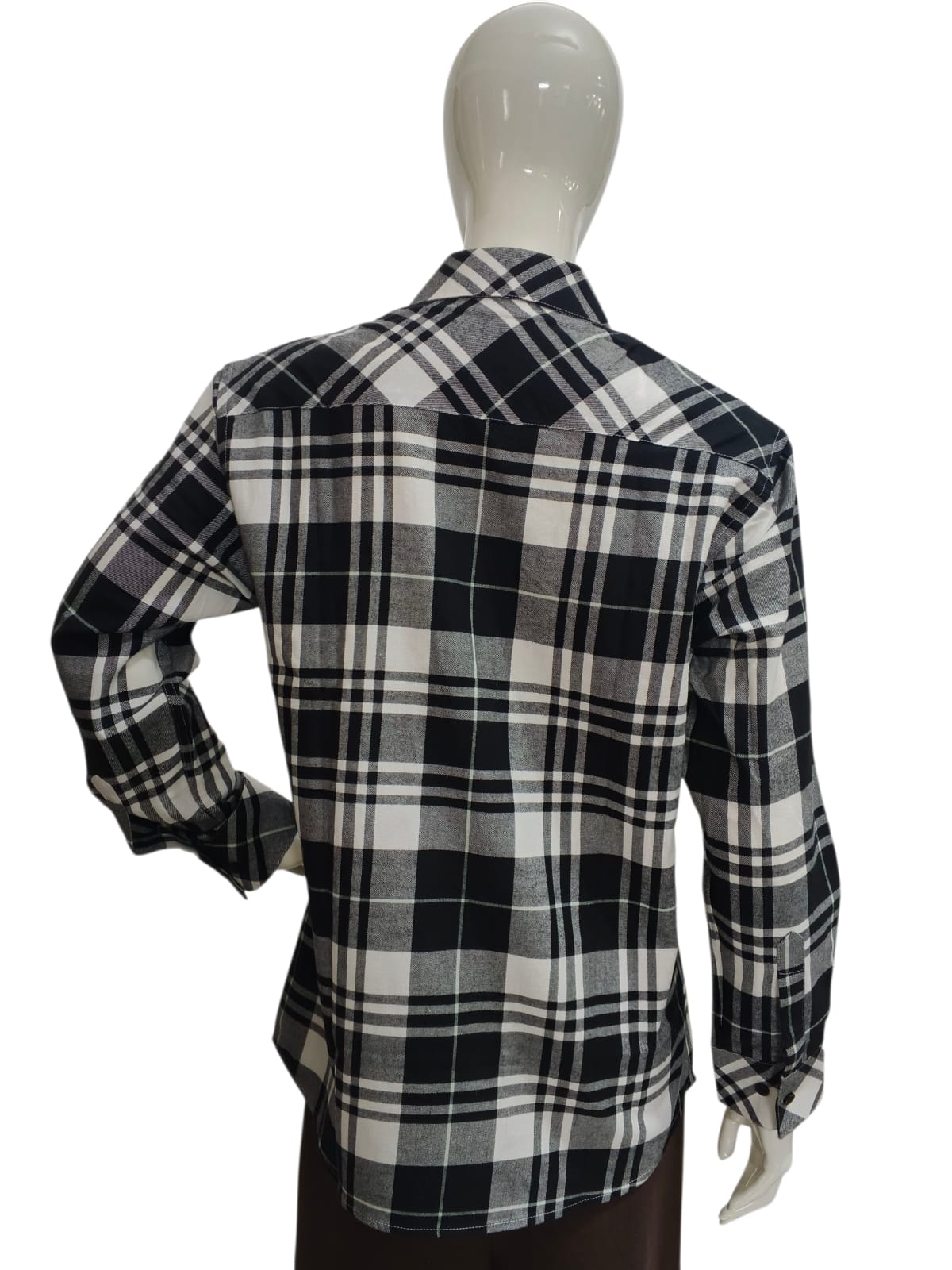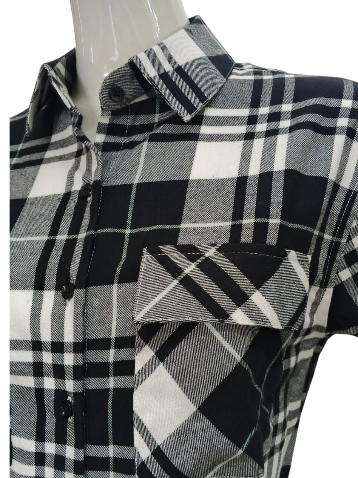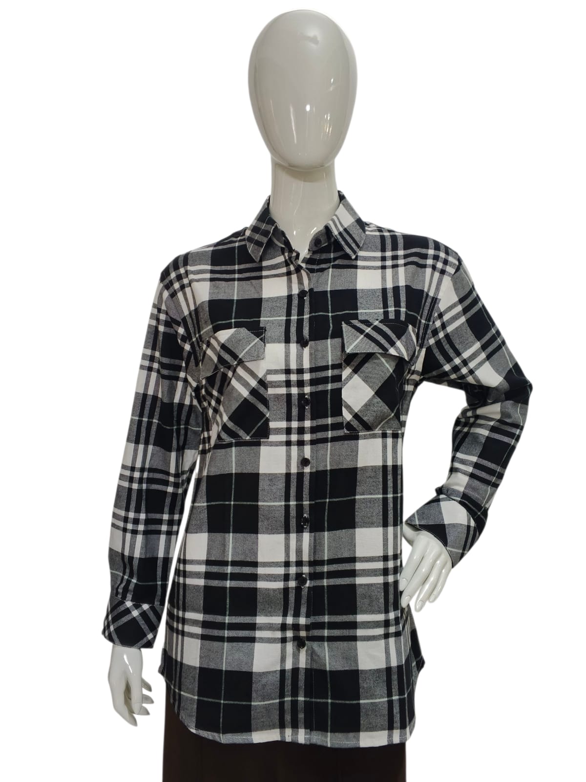 This black, white, and gray checked long flannel shirt is designed for women, offering a perfect blend of style and comfort. Featuring full sleeves and a longer length, it can be layered or worn on its own. Made from 100% cotton flannel, the shirt is soft, breathable, and durable. The classic check pattern adds a timeless touch, making it ideal for casual outings, office wear, or semi-formal occasions.
