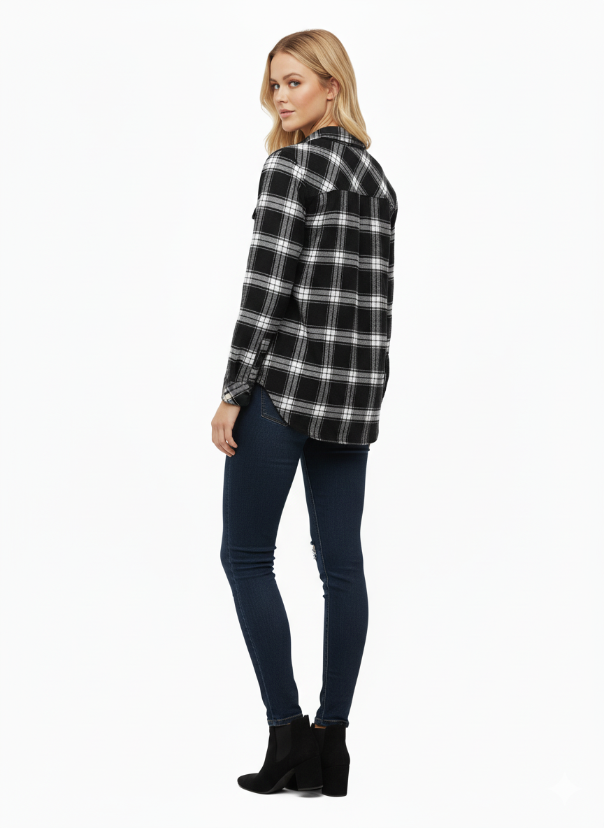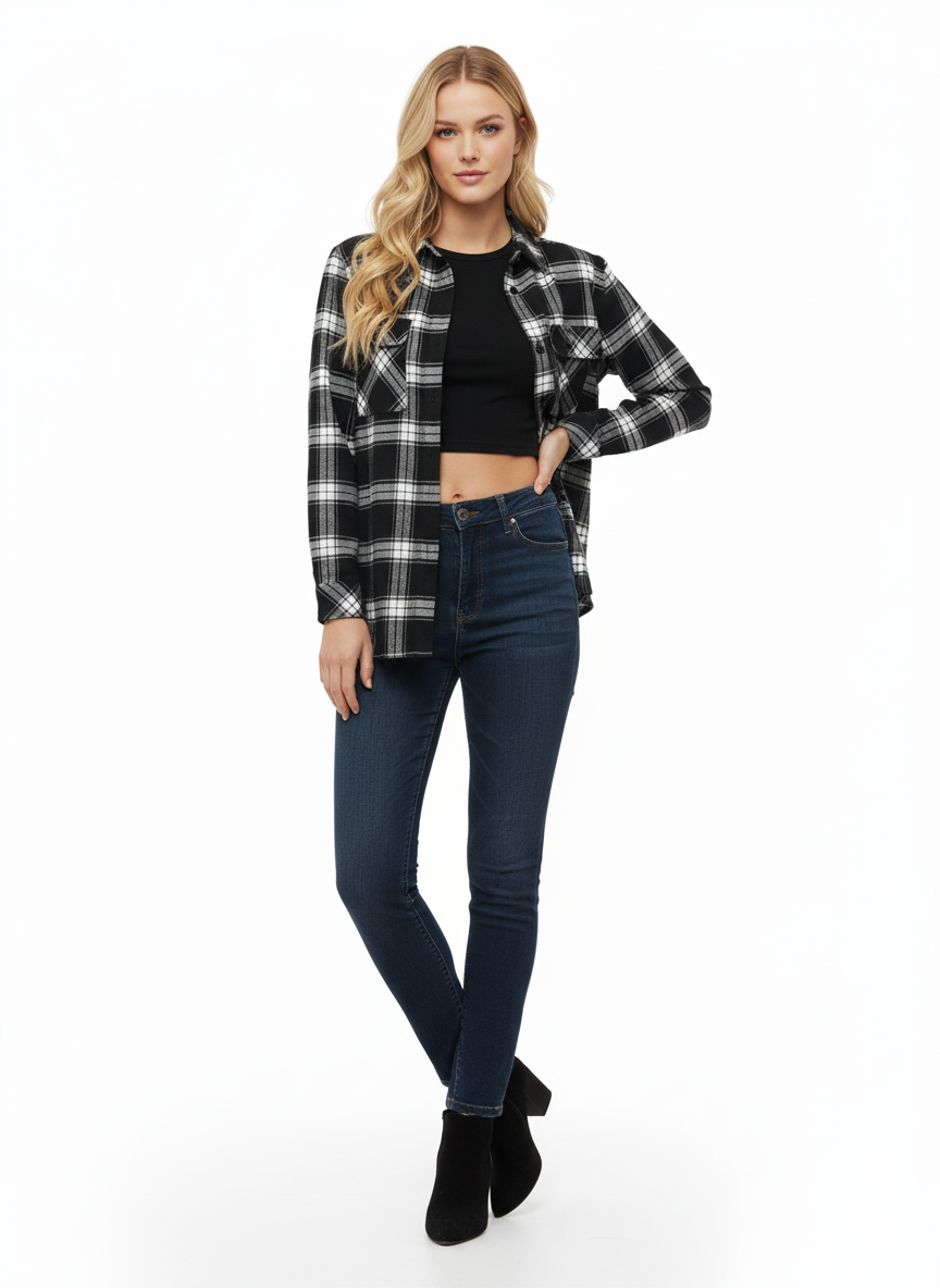 This black and white checked long flannel shirt is designed for women, combining style and comfort in a versatile piece. Featuring full sleeves and a longer length, it’s perfect for layering or wearing on its own. Made from 100% cotton flannel, the shirt is soft, breathable, and durable. The classic check pattern adds a timeless touch, making it suitable for casual outings, work, or semi-formal occasions.