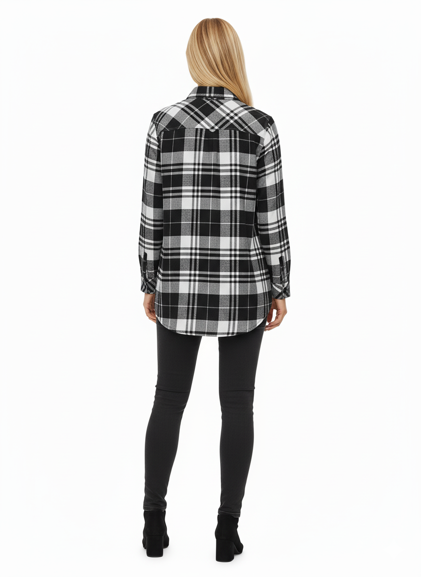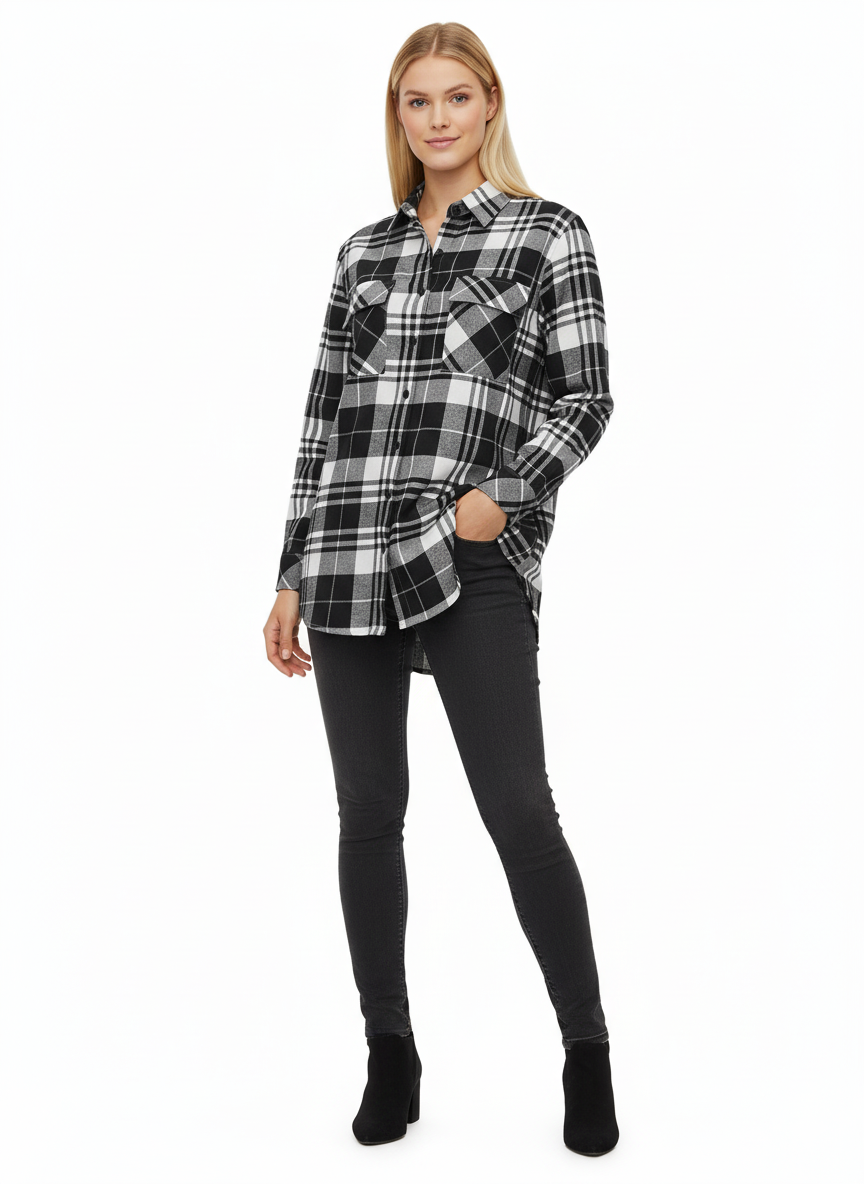 This black, white, and gray checked long flannel shirt is designed for women, offering a perfect blend of style and comfort. Featuring full sleeves and a longer length, it can be layered or worn on its own. Made from 100% cotton flannel, the shirt is soft, breathable, and durable. The classic check pattern adds a timeless touch, making it ideal for casual outings, office wear, or semi-formal occasions.